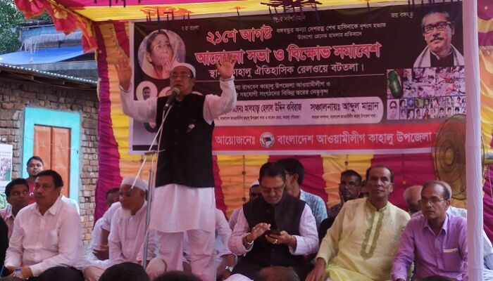 বগুড়ার কাহালু উপজেলা আওয়ামী লীগের উদ্যোগে ২১ শে আগষ্ট বঙ্গবন্ধুর কন্যা দেশ রত্ন শেখ হাসিনাকে নৃশংস হত্যার উদ্দেশ্যে গ্রেনেড হামলার প্রতিবাদে আলোচনা সভা ও বিক্ষোভ সমাবেশ সোমবার বিকেলে কাহালুর ঐতিহাসিক রেলওয়ে বটতলায় অনুষ্ঠিত হয়।