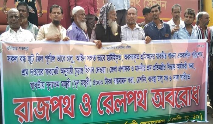 শ্রমিকরা আরোও বলেন- সকল বন্ধ থাকা জুট মিল পূরাঙ্গ ভাবে চালু, আইন সঙ্গত ভাবে ছাঁটাইকৃত, অবসরকৃত শ্রমিকদের যাবতীয় পাওনা এককালীন পরিশোধ শ্রম দপ্তরের ফরমেট অনুযায়ী চুড়ান্ত হিসাব দেওয়া, জেলা প্রশাসক ও মাননীয় শ্রম প্রতিমন্ত্রীর সিদ্ধান্ত কার্যকরী করা, যাবতীয় নূন্যতম মজুরী (মূল মজুরী) ৫০০০ টাকা বাস্তবায়ন করা, রেশনিং ব্যবস্থা চালুসহ ৬ দফা দাবিতে খুলনা-যশোর মহাসড়ক অবরোধ কর্মসূচি পালন করেছে বেসরকারি পাট সুতা ও বস্ত্রকল শ্রমিক কর্মচারী ফেডারেশন।
