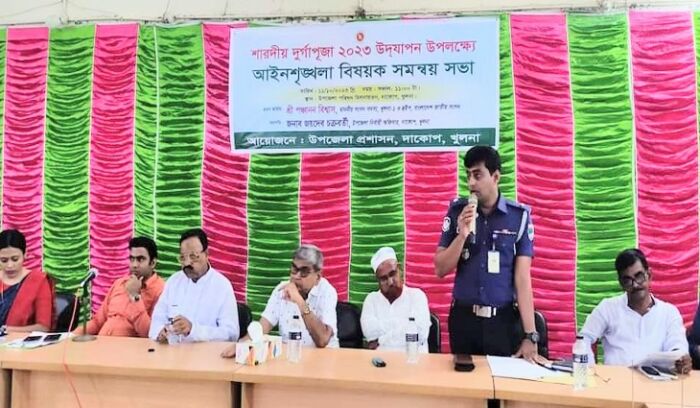 সভায় গুরত্বপূর্ণ বক্তব্য রাখেন দাকোপ থানার অফিসার ইনচার্জ জনাব উজ্জ্বল কুমার দত্ত। তিনি বলেন, দাকোপ উপজেলায় এবার ৮৪টি মন্ডপে দুর্গাপূজা অনুষ্ঠিত হবে। এ পূজ শান্তি শৃঙ্খলা রক্ষা সহ নিরাপত্তা নিশ্চিত করার জন্য ৫০৬ জন আনসার সদস্য দায়িত্বে রয়েছেন। তিনি আরও বলেন, প্রয়োজন অনুযায়ী গুরুত্বপূর্ণ পুজামন্ডপে আনসার ভিডিপি সদস্য বাড়ানো হবে আর আমাদের আইন-শৃঙ্খলা বাহিনী প্রতিটি পূজা মন্ডপে সতর্ক দৃষ্টি রাখবে যেন কোন ব্যক্তি বিশৃঙ্খলা সৃষ্টি করতে না পারে। এ সময় উপস্থিত ছিলেন বিভিন্ন মন্দিরে গন্যমান্য ব্যক্তিবর্গ।
