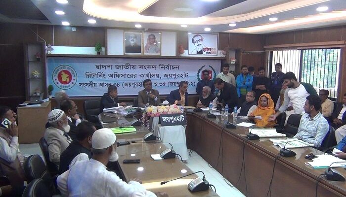 দ্বাদশ জাতীয় সংসদ নির্বাচনে জয়পুরহাট জেলার দুটি সংসদীয় আসনে ১৯ প্রার্থীর মনোনয়নপত্র বাছাই শেষে ১৬ জন প্রার্থীর মনোনয়ন বৈধ এবং কাগজপত্রে ত্রুটি থাকায় তিন’ জনের মনোনয়ন বাতিল ঘোষণা করা হয়েছে।
