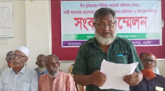 নড়াইলের লোহাগড়ায় বীর মুক্তিযোদ্ধা ও অবসরপ্রাপ্ত সিনিয়র ওয়ারেন্ট অফিসার কাজী ছানোয়ার হোসেনের উপর সন্ত্রাসী হামলার প্রতিবাদে সংবাদ সম্মেলন অনুষ্ঠিত হয়েছে।