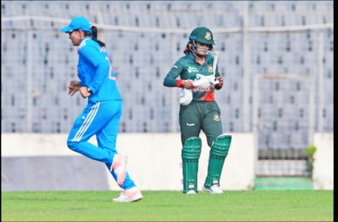 এর আগে টস হেরে ব্যাট করতে নামা ভারতের ইনিংসে পঞ্চম ওভারে আঘাত হেনেছিলেন মারুফা আক্তার। দারুণ ইনস্যুইঙ্গারে বোল্ড করে দিয়েছিলেন প্রিয়া পুনিয়াকে। পরে স্বস্তিকা ভাটিয়াকে রান আউট করে দলকে ভালো শুরু পাইয়ে দিয়েছিলেন তিনি। যদিও স্মৃতি মান্ধানা, হারমানপ্রিত কাউর আর জেমাইমার ব্যাটে চাপ জারি রাখা যায়নি। ওপেনার স্মৃতি ৩৬রান করে আউট হলেও ফিফটি আসে ভারত অধিনায়ক হারমানপ্রিতের ব্যাটে।